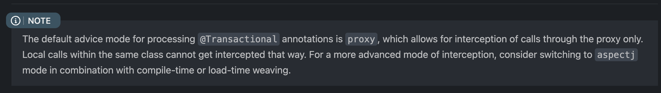 제 생각엔 내부에서 호출되는 메서드는 private으로 관리하고 public 메서드에만 @Transactional 어노테이션을 사용하는 게 좋을 것 같습니다. 그리고 @Transactional 어노테이션을 추가할 때는 항상 신중하게 선택해야 할 것 같습니다.